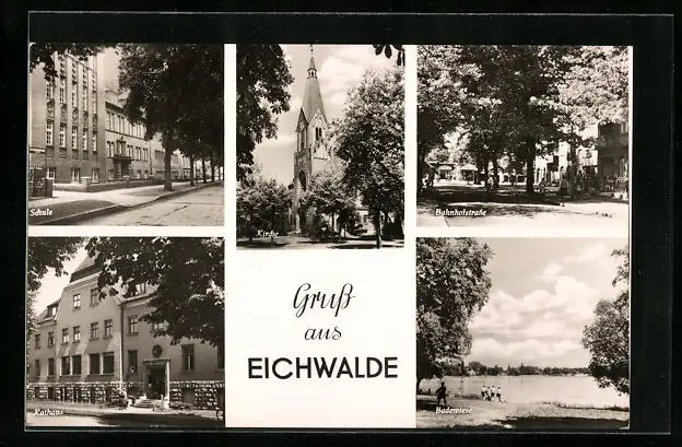 AK Eichwalde, Ansichten Schule, Kirche, Bahnhofstrasse