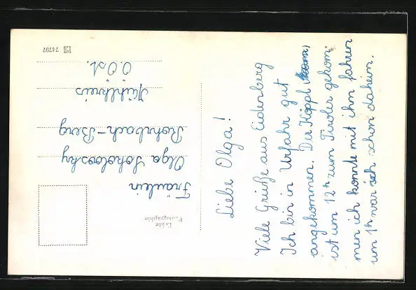 Personenbezogene Daten auf der Rückseite der Karte wurden durch blauen Textmarker unkenntlich gemacht. Die blauen Stellen sind auf die Vorderseite durchgeweicht und wirken sich negativ auf das Postkartenfoto aus