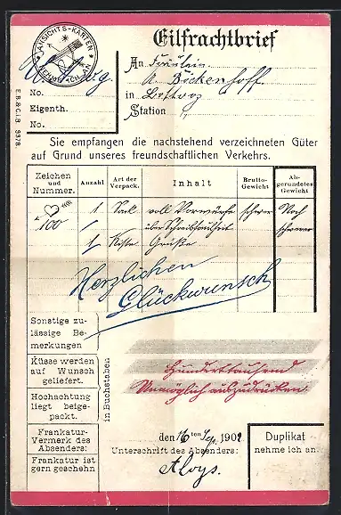 AK Eilfrachtbrief mit Tabelle, Schreibfaul
