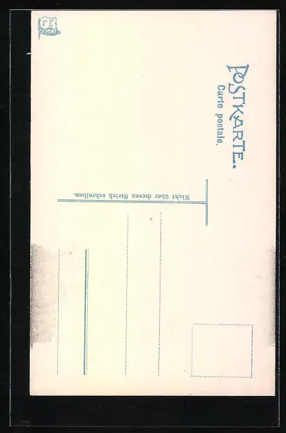 Personenbezogene Daten auf der Rückseite der Karte wurden durch blauen Textmarker unkenntlich gemacht. Die blauen Stellen sind auf die Vorderseite durchgeweicht und wirken sich negativ auf das Postkartenfoto aus