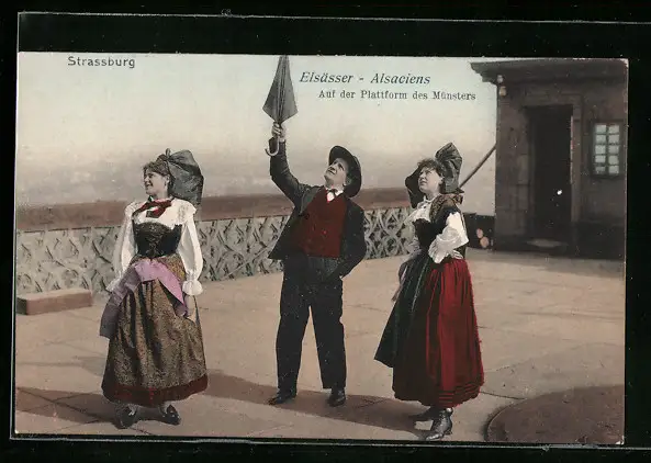AK Ein Herr und zwei Damen in Elsässer Tracht in den Himmel schauend