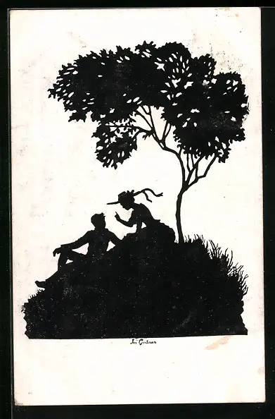 AK Ein Liebespaar unterm Baum, Scherenschnitt