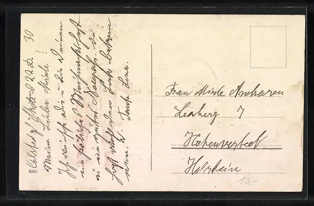 Personenbezogene Daten auf der Rückseite der Karte wurden durch blauen Textmarker unkenntlich gemacht. Die blauen Stellen sind auf die Vorderseite durchgeweicht und wirken sich negativ auf das Postkartenfoto aus