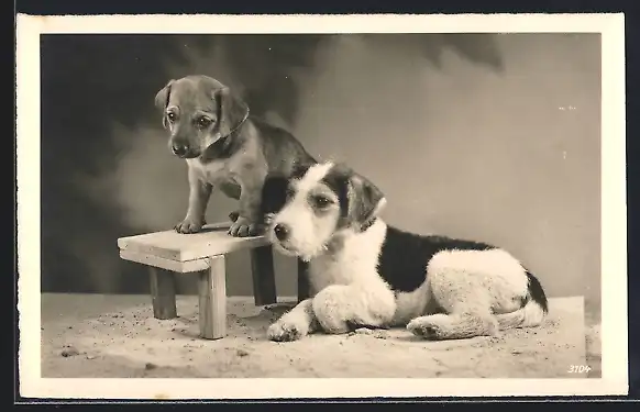 AK Ein Terrier liegt im Sand mit einem Welpen