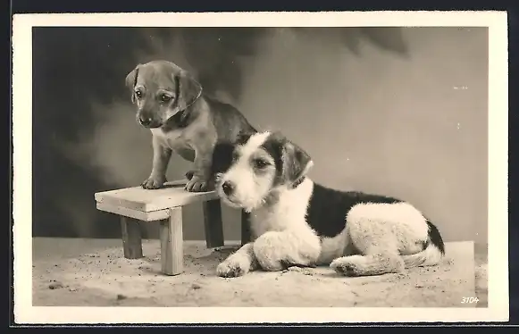 AK Ein Terrier liegt im Sand mit einem Welpen