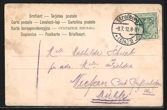 gelaufen 1912, Eckknicke oben und re. unten, Bugspur li. oben, guter Zustand