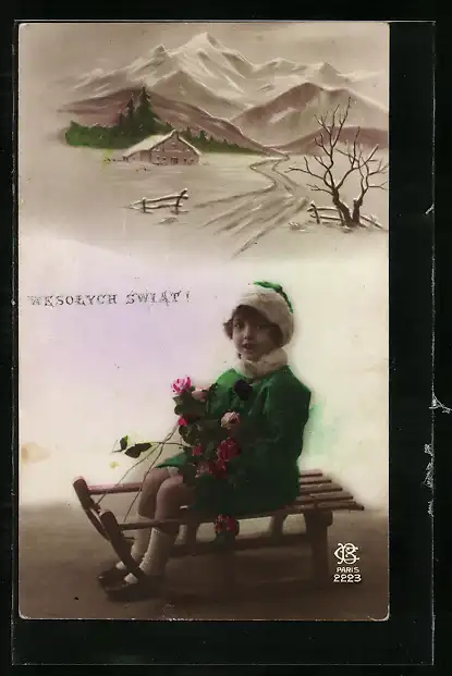 AK Ein junges Mädchen im winterlichen Outfit auf einem Schlitten