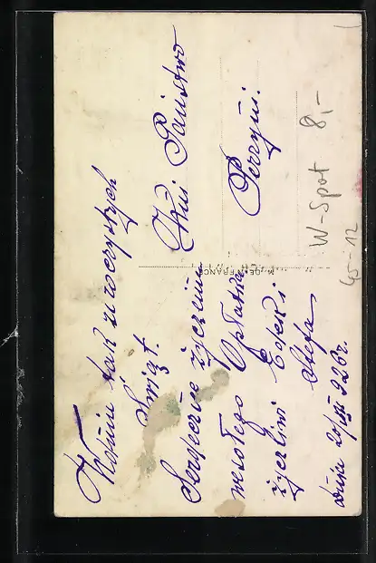 Personenbezogene Daten auf der Rückseite der Karte wurden durch blauen Textmarker unkenntlich gemacht. Die blauen Stellen sind auf die Vorderseite durchgeweicht und wirken sich negativ auf das Postkartenfoto aus