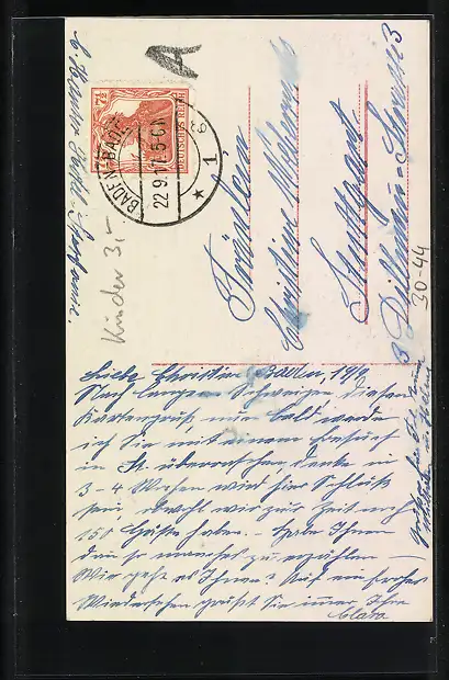 Personenbezogene Daten auf der Rückseite der Karte wurden durch blauen Textmarker unkenntlich gemacht. Die blauen Stellen sind auf die Vorderseite durchgeweicht und wirken sich negativ auf das Postkartenfoto aus