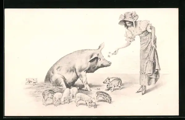 AK Eine Dame füttert eine Muttersau mit Kleeblättern
