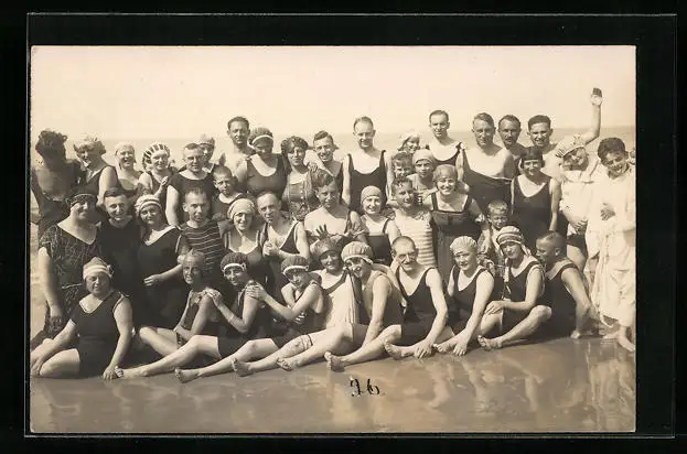 AK Eine grosse Gruppe an Eltern mit ihren Kindern in Bademode am Strand