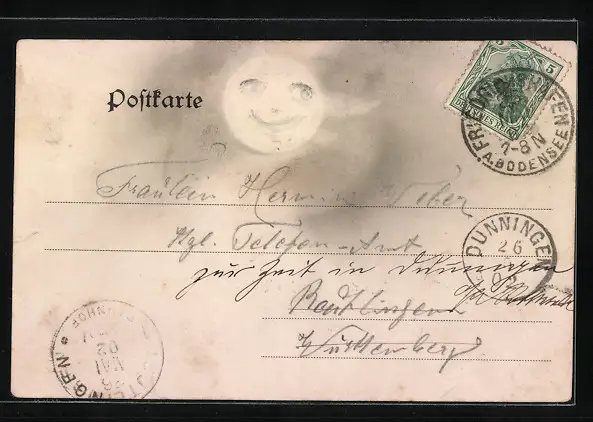 Personenbezogene Daten auf der Rückseite der Karte wurden durch blauen Textmarker unkenntlich gemacht. Die blauen Stellen sind auf die Vorderseite durchgeweicht und wirken sich negativ auf das Postkartenfoto aus