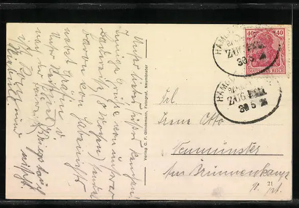 Personenbezogene Daten auf der Rückseite der Karte wurden durch blauen Textmarker unkenntlich gemacht. Die blauen Stellen sind auf die Vorderseite durchgeweicht und wirken sich negativ auf das Postkartenfoto aus