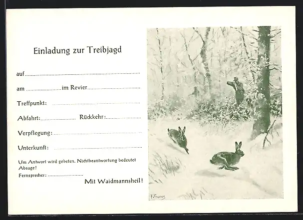 AK Einladung zur Treibjagd, Jäger schiesst auf Hasen im Schnee