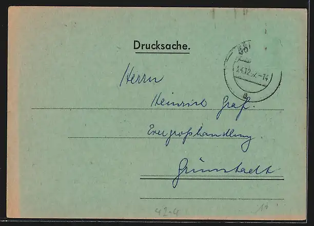 Personenbezogene Daten auf der Rückseite der Karte wurden durch blauen Textmarker unkenntlich gemacht. Die blauen Stellen sind auf die Vorderseite durchgeweicht und wirken sich negativ auf das Postkartenfoto aus