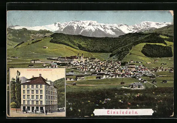 AK Einsiedeln, Gasthaus St. Johann, Ortspanorama mit Gebirge