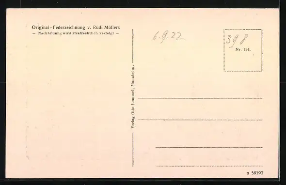 Personenbezogene Daten auf der Rückseite der Karte wurden durch blauen Textmarker unkenntlich gemacht. Die blauen Stellen sind auf die Vorderseite durchgeweicht und wirken sich negativ auf das Postkartenfoto aus