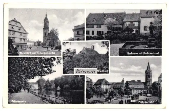Ansichtskarte Eisenach fünf Abb. - Marktpl. und Georgenkirche, Bachhaus mit Denkmal, Wartburg, Prinzenteich, Platz der DSF mit Straßenbahn Erhaltung I-II postalisch gelaufen, gestempelt: Eisenach 1, 13.11.58, Nachgebühr Druckvermerk: 1958 Herstellungsland: DDR Verlag: Heldge-Verlag, Köthen Anhalt - D859