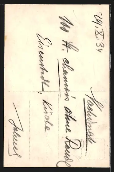 Personenbezogene Daten auf der Rückseite der Karte wurden durch blauen Textmarker unkenntlich gemacht. Die blauen Stellen sind auf die Vorderseite durchgeweicht und wirken sich negativ auf das Postkartenfoto aus