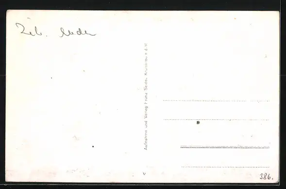 Personenbezogene Daten auf der Rückseite der Karte wurden durch blauen Textmarker unkenntlich gemacht. Die blauen Stellen sind auf die Vorderseite durchgeweicht und wirken sich negativ auf das Postkartenfoto aus