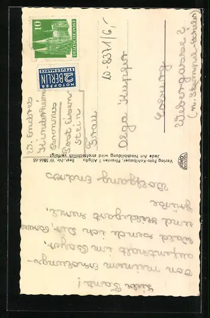 Personenbezogene Daten auf der Rückseite der Karte wurden durch blauen Textmarker unkenntlich gemacht. Die blauen Stellen sind auf die Vorderseite durchgeweicht und wirken sich negativ auf das Postkartenfoto aus