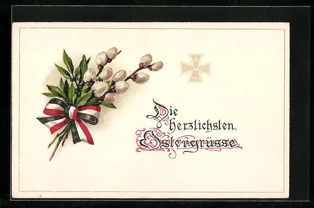 AK Eisernes Kreuz, Reichsfahne und Weidenkätzchen, Ostergruss