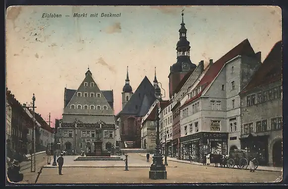 AK Eisleben, Markt mit Denkmal und Geschäften