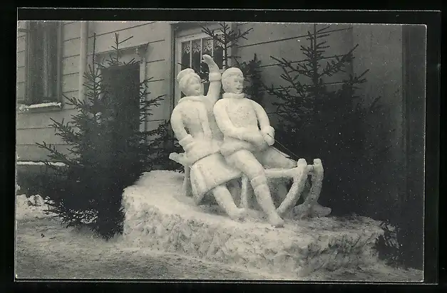 AK Eisplastik Mann und Frau auf einem Schlitten
