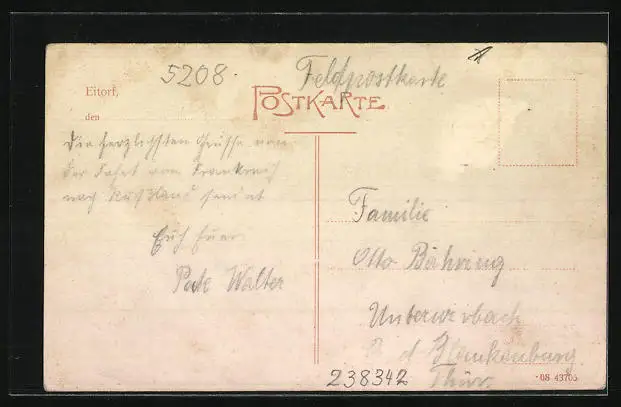 Personenbezogene Daten auf der Rückseite der Karte wurden durch blauen Textmarker unkenntlich gemacht. Die blauen Stellen sind auf die Vorderseite durchgeweicht und wirken sich negativ auf das Postkartenfoto aus