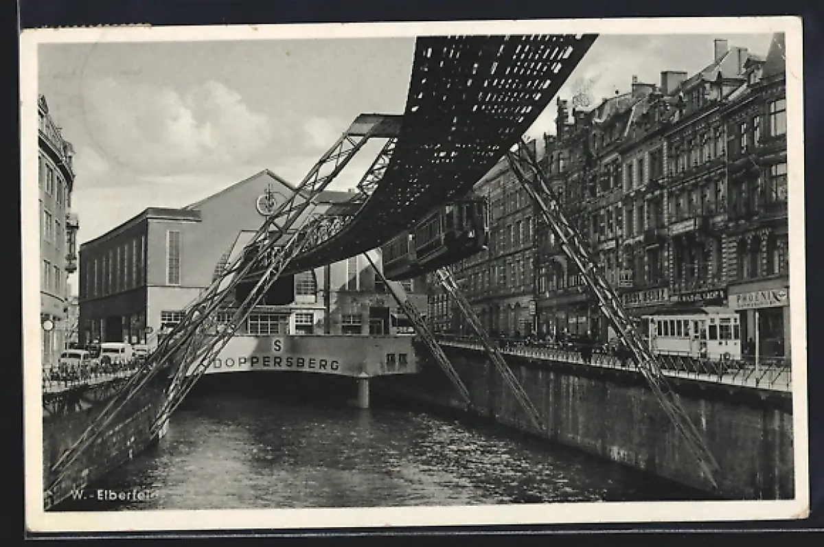 AK Elberfeld, Schwebebahn mit Bahnhof Döppersberg, Ladenstrasse und Strassenbahn