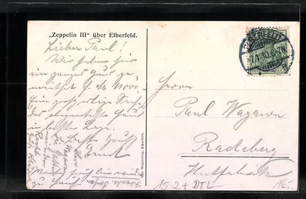 Personenbezogene Daten auf der Rückseite der Karte wurden durch blauen Textmarker unkenntlich gemacht. Die blauen Stellen sind auf die Vorderseite durchgeweicht und wirken sich negativ auf das Postkartenfoto aus