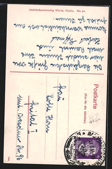 Personenbezogene Daten auf der Rückseite der Karte wurden durch blauen Textmarker unkenntlich gemacht. Die blauen Stellen sind auf die Vorderseite durchgeweicht und wirken sich negativ auf das Postkartenfoto aus