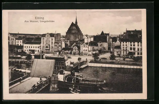 AK Elbing, Am Wasser, Leegebrücke mit Gasthof, Bäckerei und Boot
