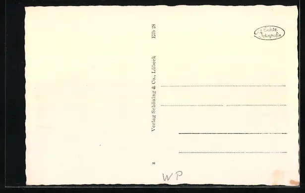 Personenbezogene Daten auf der Rückseite der Karte wurden durch blauen Textmarker unkenntlich gemacht. Die blauen Stellen sind auf die Vorderseite durchgeweicht und wirken sich negativ auf das Postkartenfoto aus