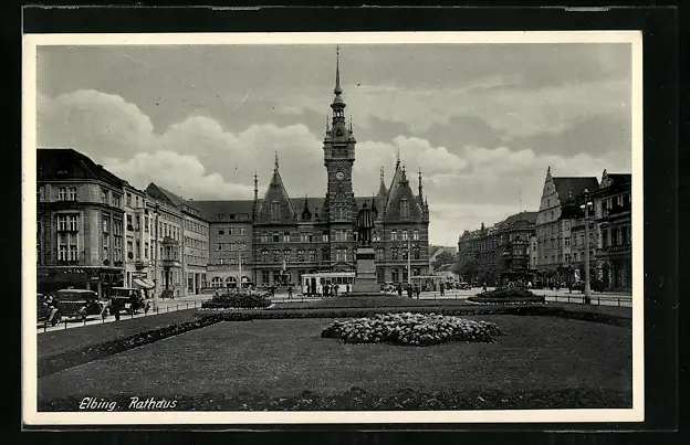 AK Elbing, Rathaus mit Anlagen und Strassenbahn