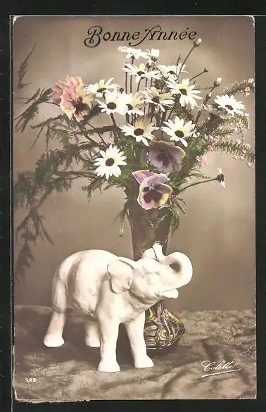 AK Elephantenstatuetten vor einer Blumenvase