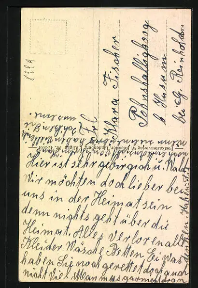 Personenbezogene Daten auf der Rückseite der Karte wurden durch blauen Textmarker unkenntlich gemacht. Die blauen Stellen sind auf die Vorderseite durchgeweicht und wirken sich negativ auf das Postkartenfoto aus