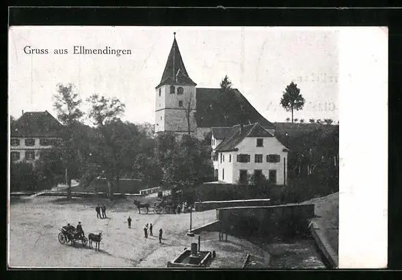 AK Ellmendingen, Ortspartie mit Kirche und Pferdewägen, Neujahrsgruss