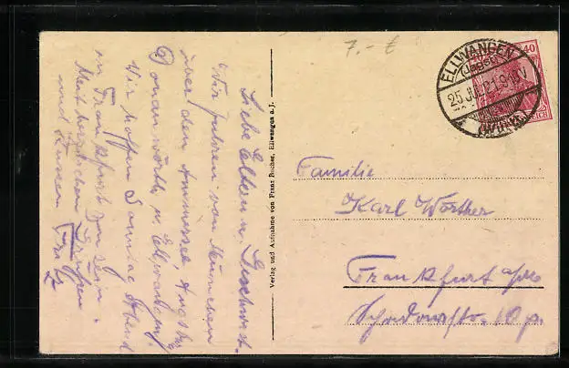 Personenbezogene Daten auf der Rückseite der Karte wurden durch blauen Textmarker unkenntlich gemacht. Die blauen Stellen sind auf die Vorderseite durchgeweicht und wirken sich negativ auf das Postkartenfoto aus
