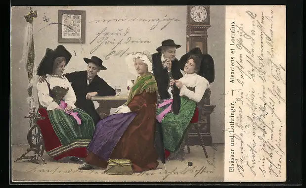 AK Elsässer und Lothringer Trachten, Männer und Frauen am Tisch