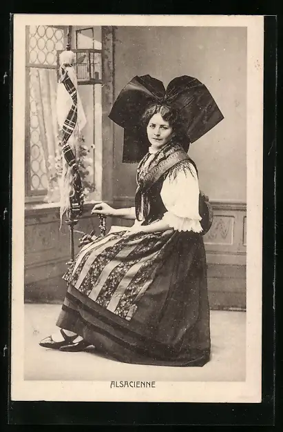 AK Elsässerin in Tracht am Spinnrad