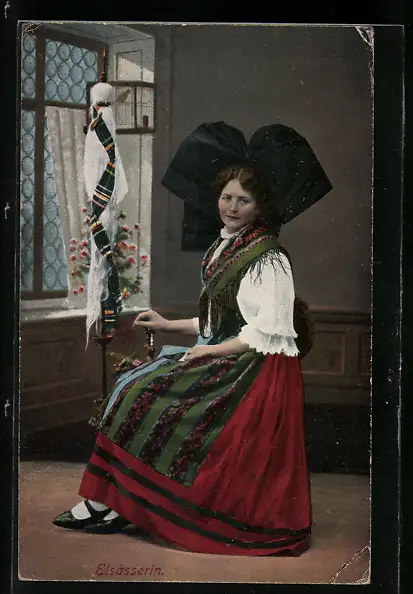 AK Elsässerin in Tracht am Spinnrad