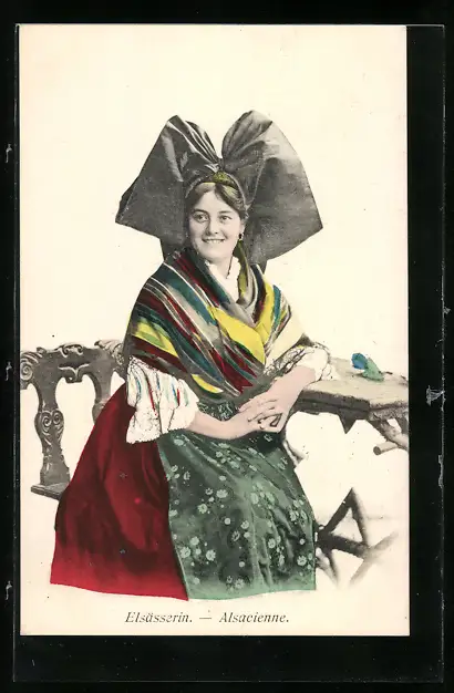 AK Elsässerin in Tracht am Tisch