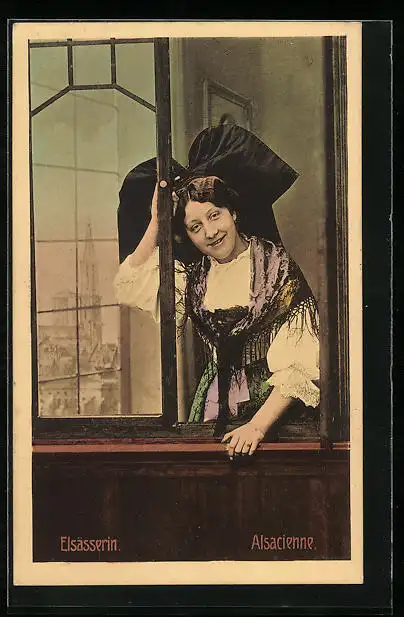 AK Elsässerin in Tracht an einem Fenster