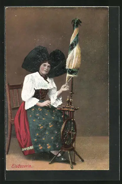 AK Elsässerin in elsass-lothringischer Tracht am Spinnrad