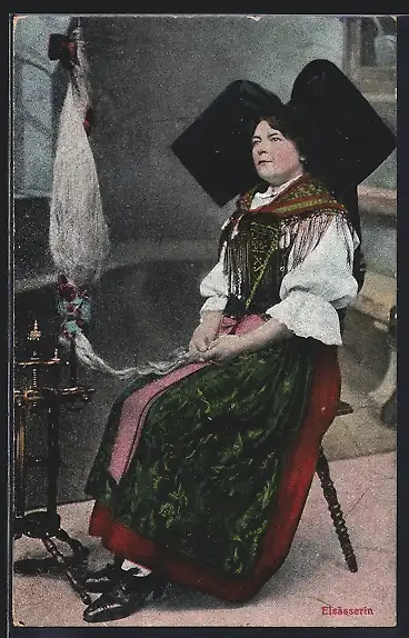 AK Elsässerin in elsass-lothringischer Tracht am Spinnrad
