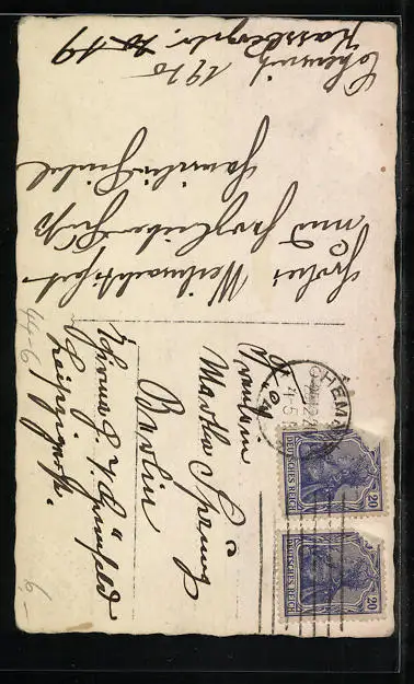 Personenbezogene Daten auf der Rückseite der Karte wurden durch blauen Textmarker unkenntlich gemacht. Die blauen Stellen sind auf die Vorderseite durchgeweicht und wirken sich negativ auf das Postkartenfoto aus