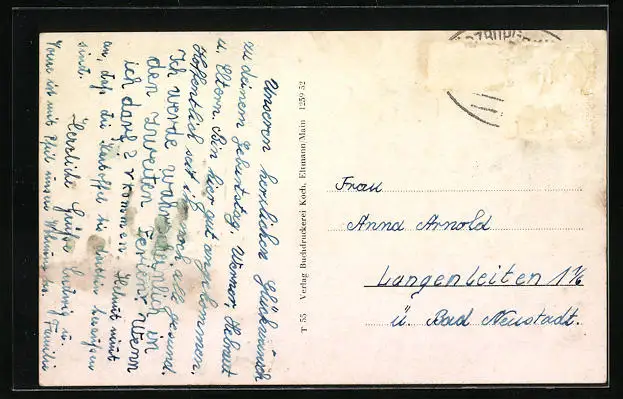 Personenbezogene Daten auf der Rückseite der Karte wurden durch blauen Textmarker unkenntlich gemacht. Die blauen Stellen sind auf die Vorderseite durchgeweicht und wirken sich negativ auf das Postkartenfoto aus