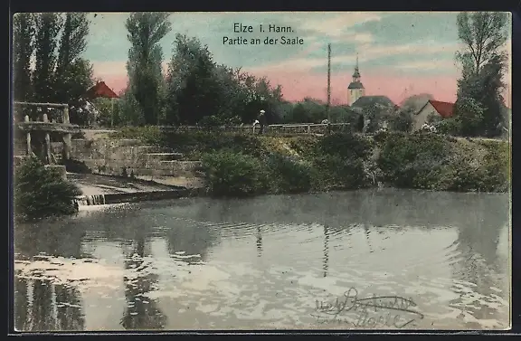AK Elze i. Hann., Partie an der Saale mit Kirche