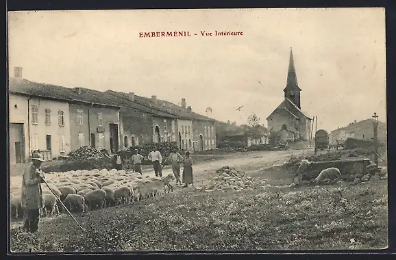 AK Emberménil, Vue intérieure avec troupeau de moutons et église en arrière-plan